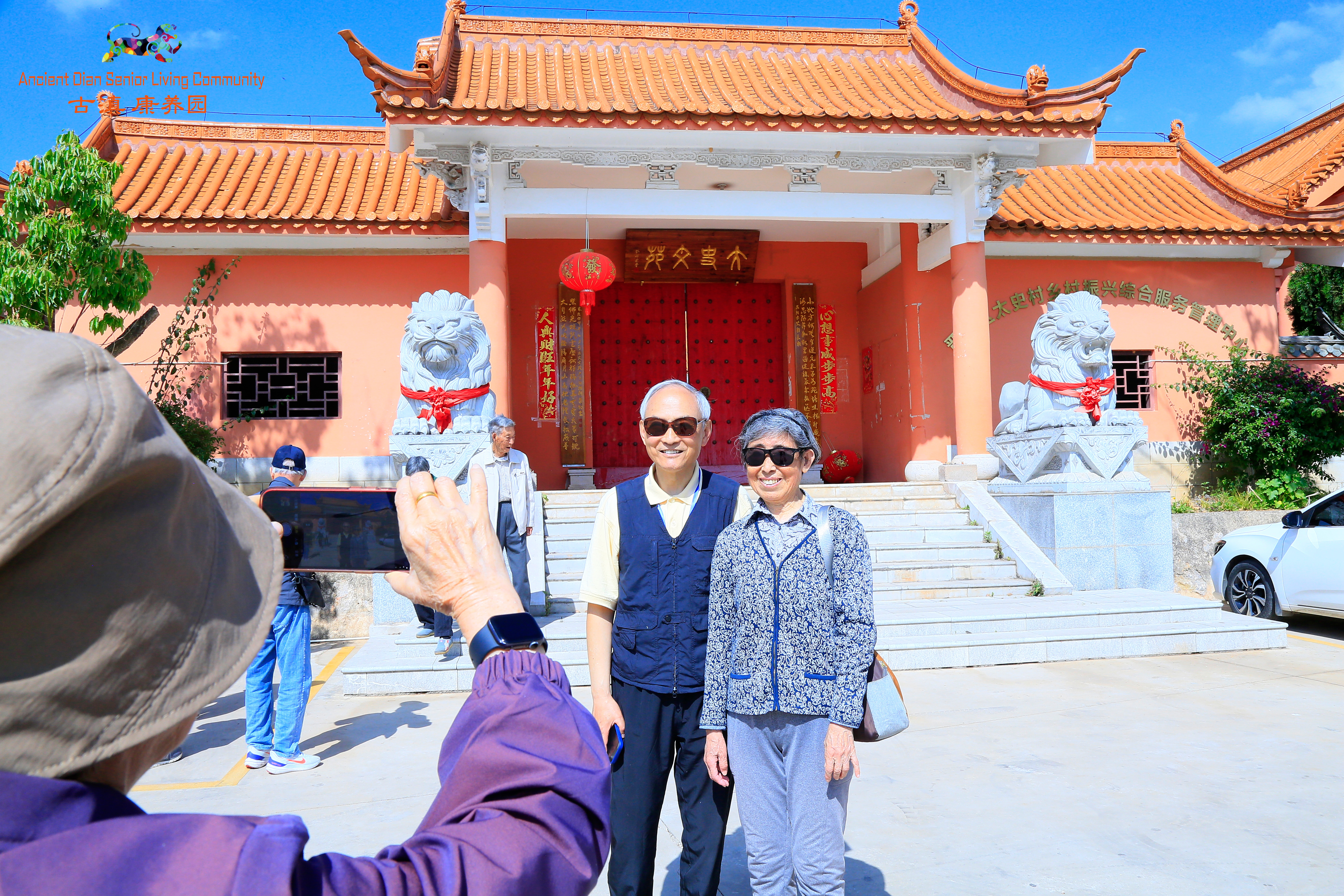滇池的波光荡漾到最南端,一座青瓦白墙的古村静卧在群山怀抱中。这里就是最美公路的起点,也是有着悠久历史的古老村落——太史村。4月,在风和日丽的好天气里,古滇康养园的爷爷奶奶们兴致勃勃地来到了太史村游玩。